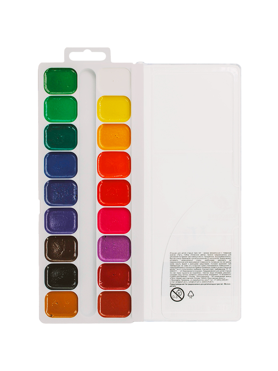 Краски изготовлены на медовой основе, легко растворяются водой и равномерно наносятся на бумагу, создавая яркие и прозрачные оттенки. Благодаря увеличенному количеству цветов набор позволяет создавать более сложные и разнообразные рисунки.