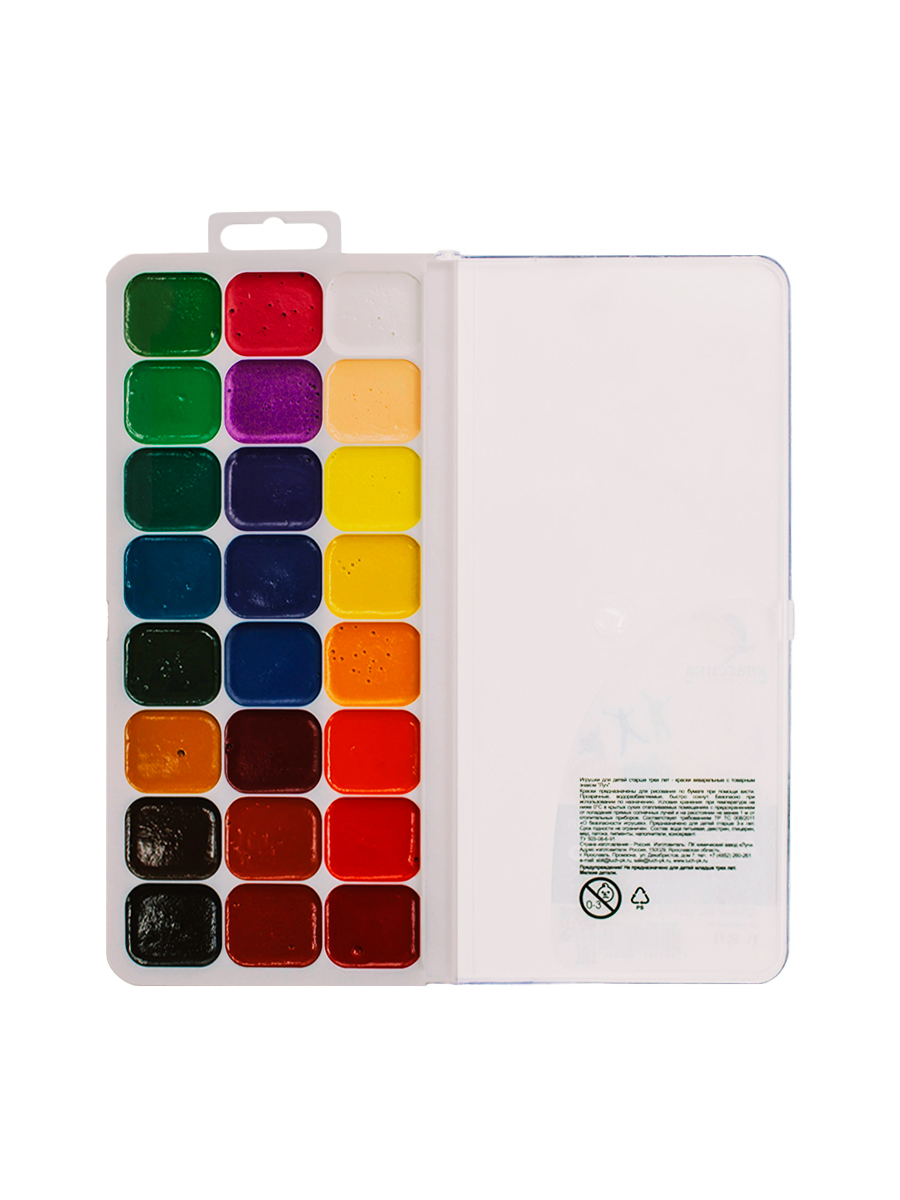 Краски изготовлены на медовой основе, благодаря чему легко разводятся водой и равномерно ложатся на бумагу, создавая насыщенные и прозрачные оттенки. Большое количество цветов позволяет рисовать более сложные и яркие композиции.
