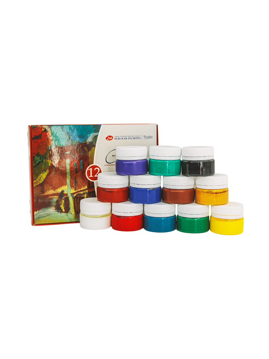 Набор включает 12 насыщенных цветов с высокой пигментацией, которые обеспечивают плотное и равномерное покрытие. Краски легко смешиваются между собой, позволяя получать чистые и глубокие оттенки.