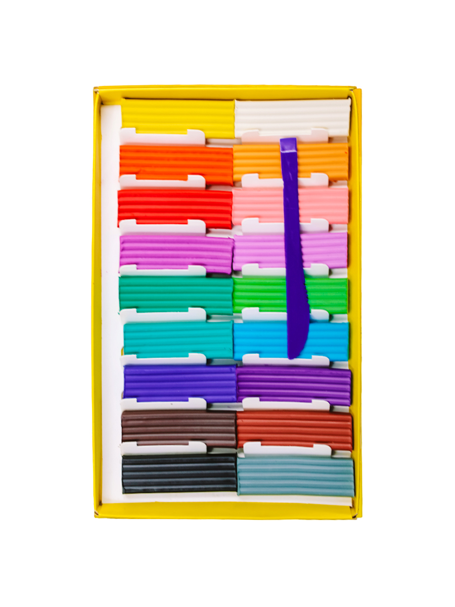 В наборе 18 ярких цветов и стек, который помогает аккуратно прорабатывать детали и делает процесс лепки более комфортным.